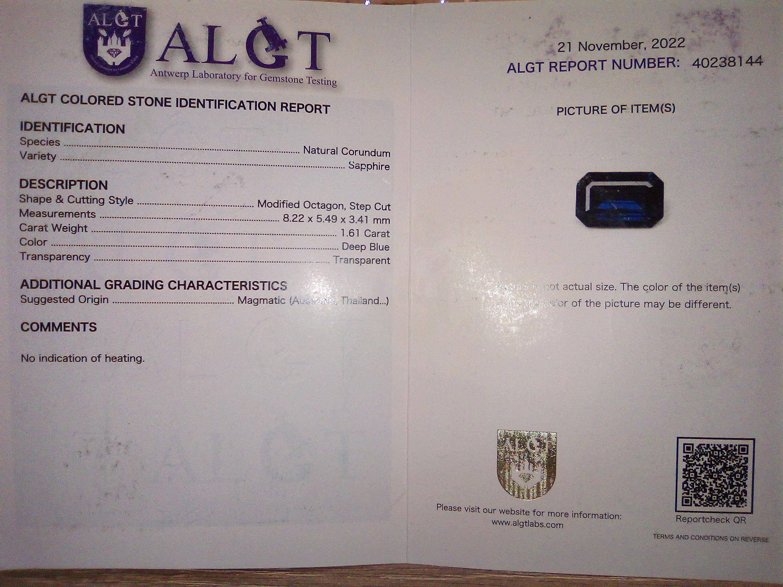 Verified Elegance This masterfully crafted piece features a 1.6-carat midnight sapphire accompanied by a prestigious ALGT (Antwerp Laboratory for Gemstone Testing) Certificate. The certification ensures the authenticity and quality of the deep, velvety hue, providing you with absolute confidence in your investment.