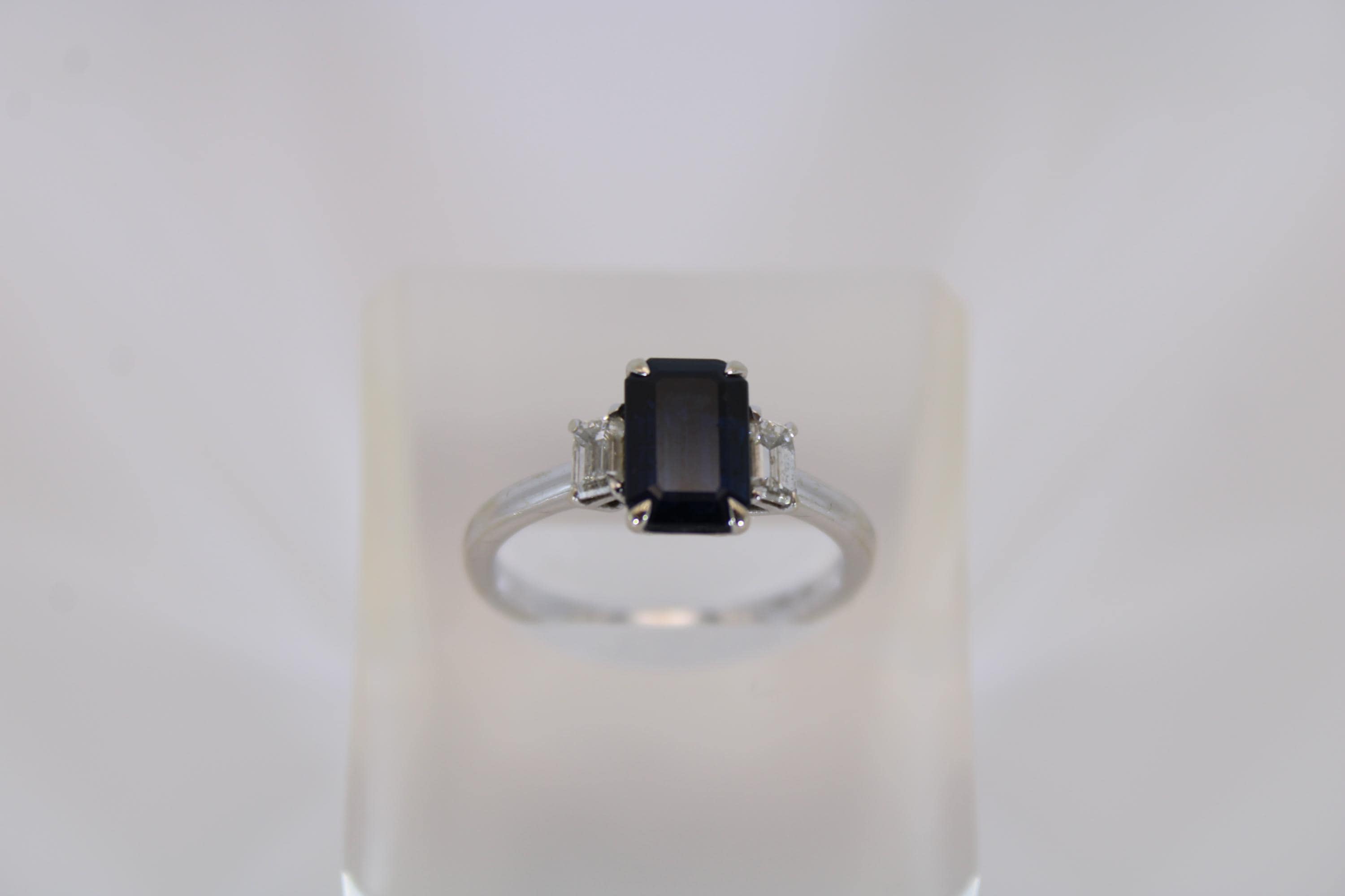 The Design The center stone is showcased in a sophisticated emerald cut, an architectural choice that highlights the gem's internal clarity and saturated depth. Flanked by two shimmering tapered baguettes, the three-stone arrangement offers a classic, regal silhouette that sits beautifully on the hand.