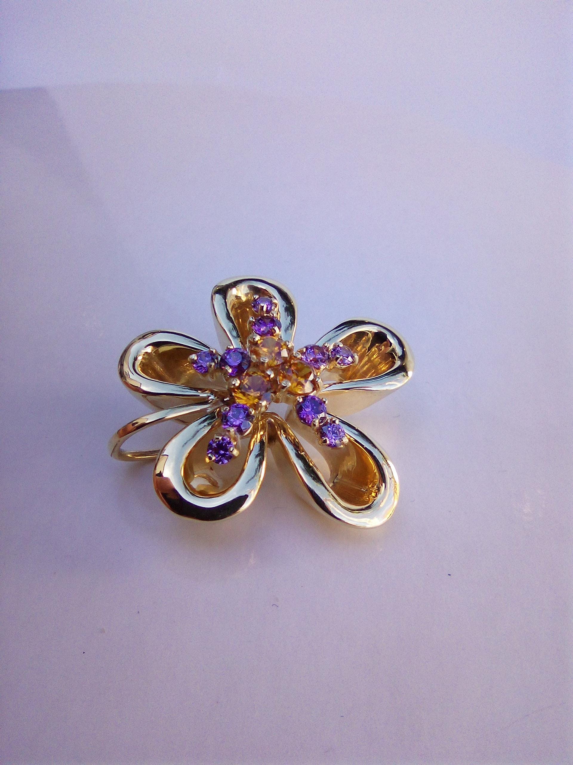 Elevate your collection with these stunning 18K yellow gold earrings, featuring a masterful blend of royal purple and sun-kissed amber tones. Designed with an elegant five-petal openwork motif, these earrings capture a perfect balance of modern luxury and botanical charm.