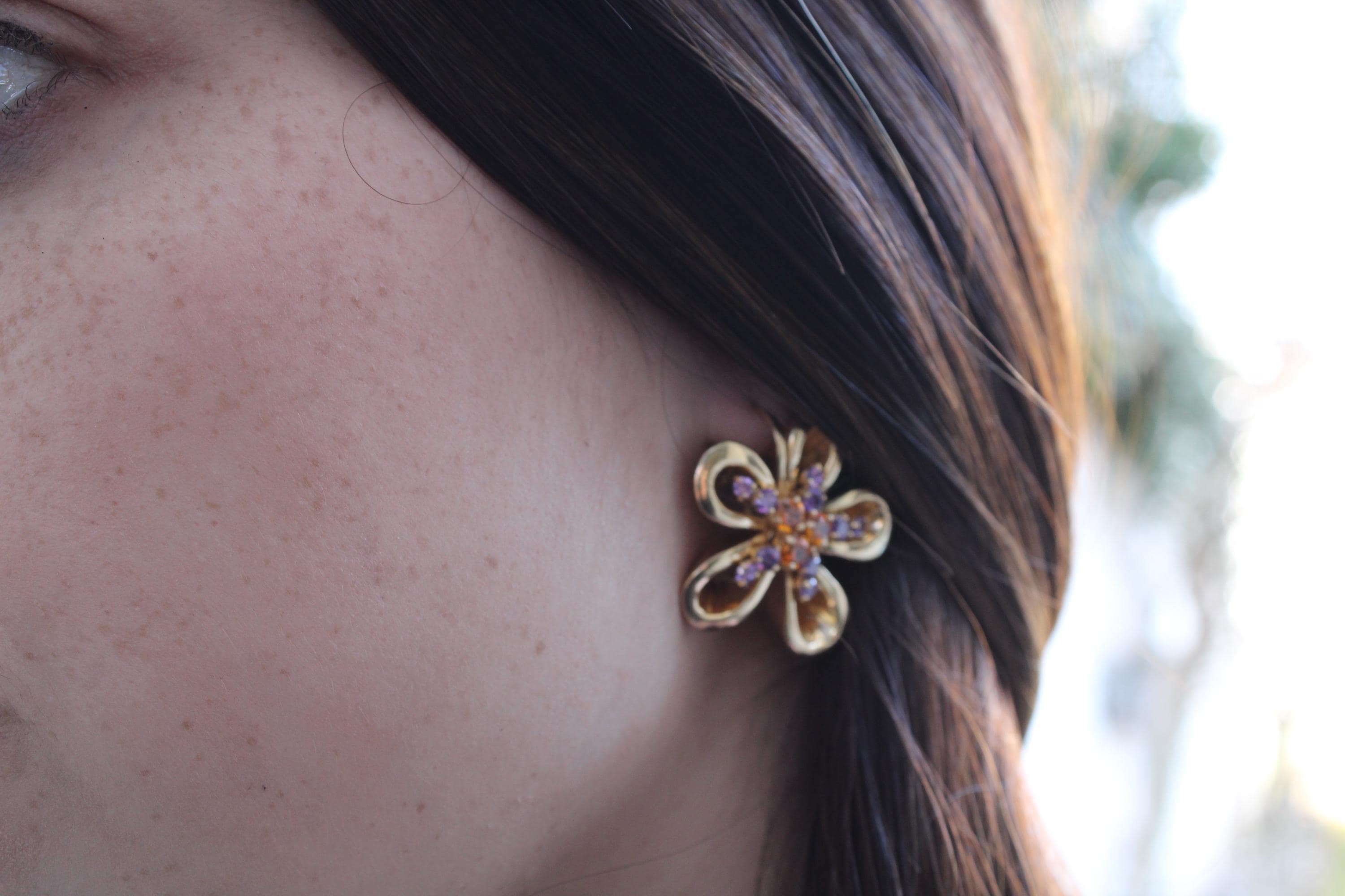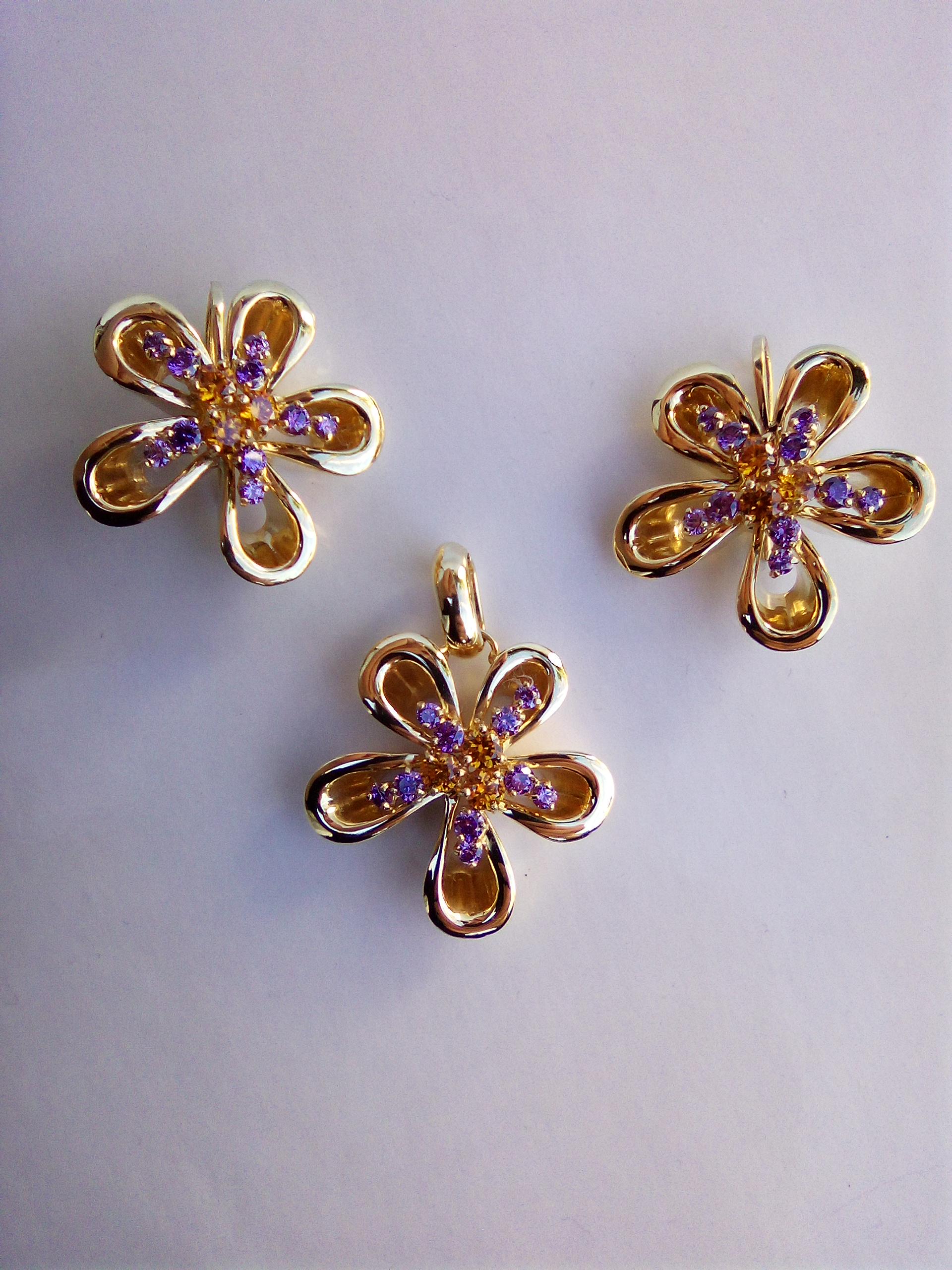 18K Yellow Gold Flower Stud Earrings with gemstones Purple Amethyst & Yellow Citrine