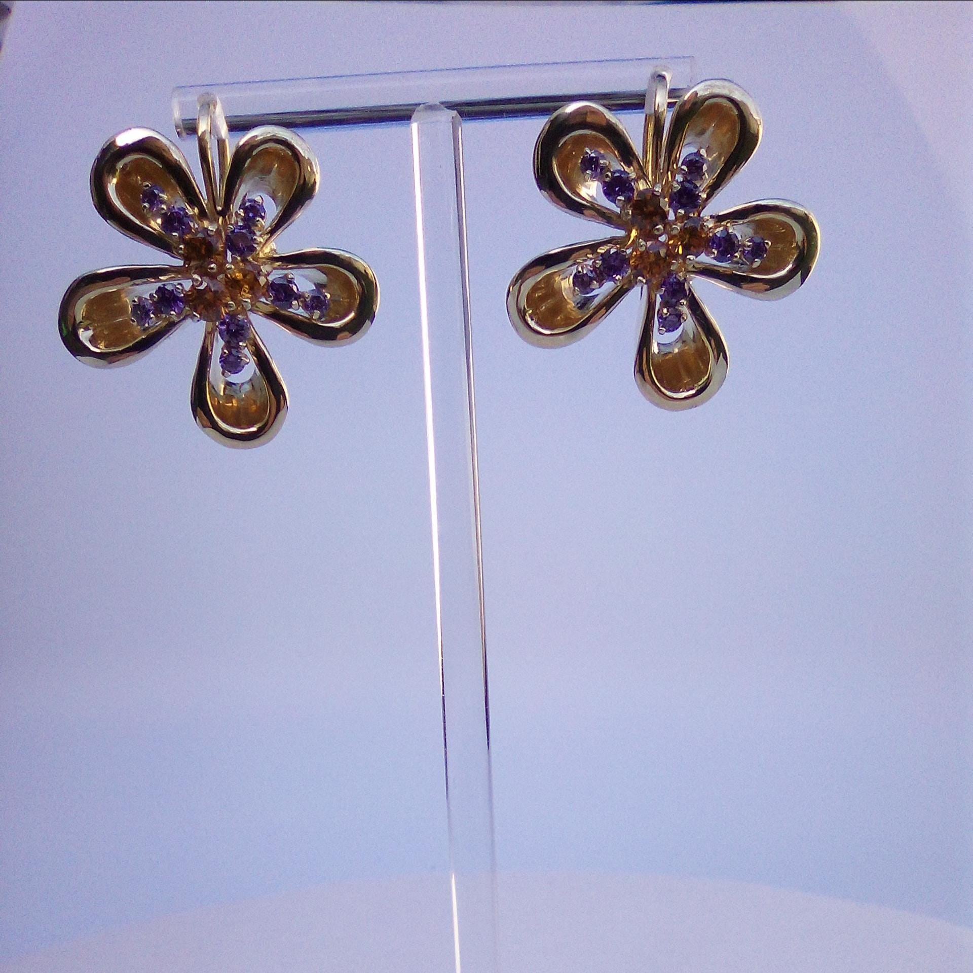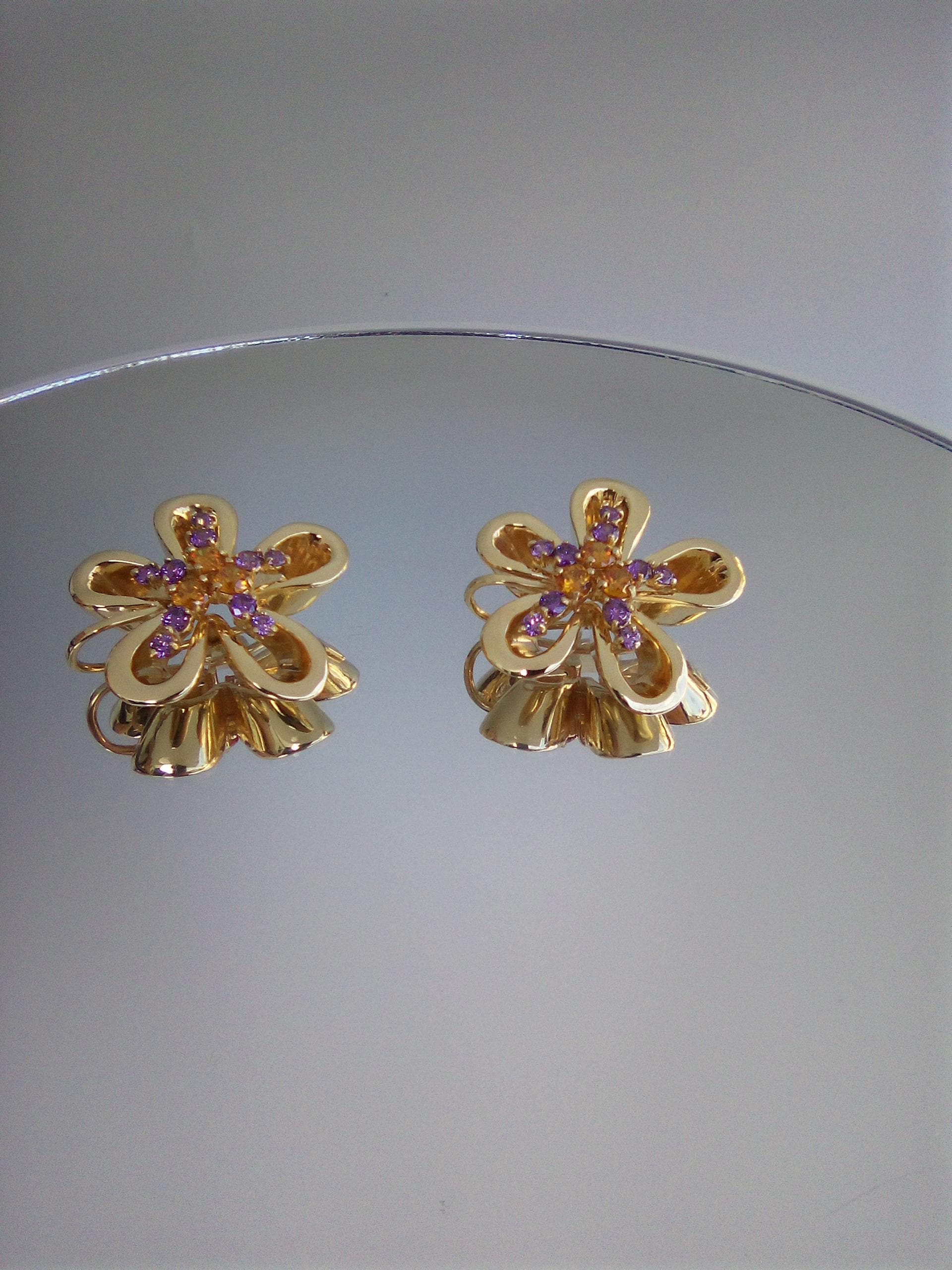 Exquisite 18K Yellow Gold Amethyst & Citrine Floral Earrings